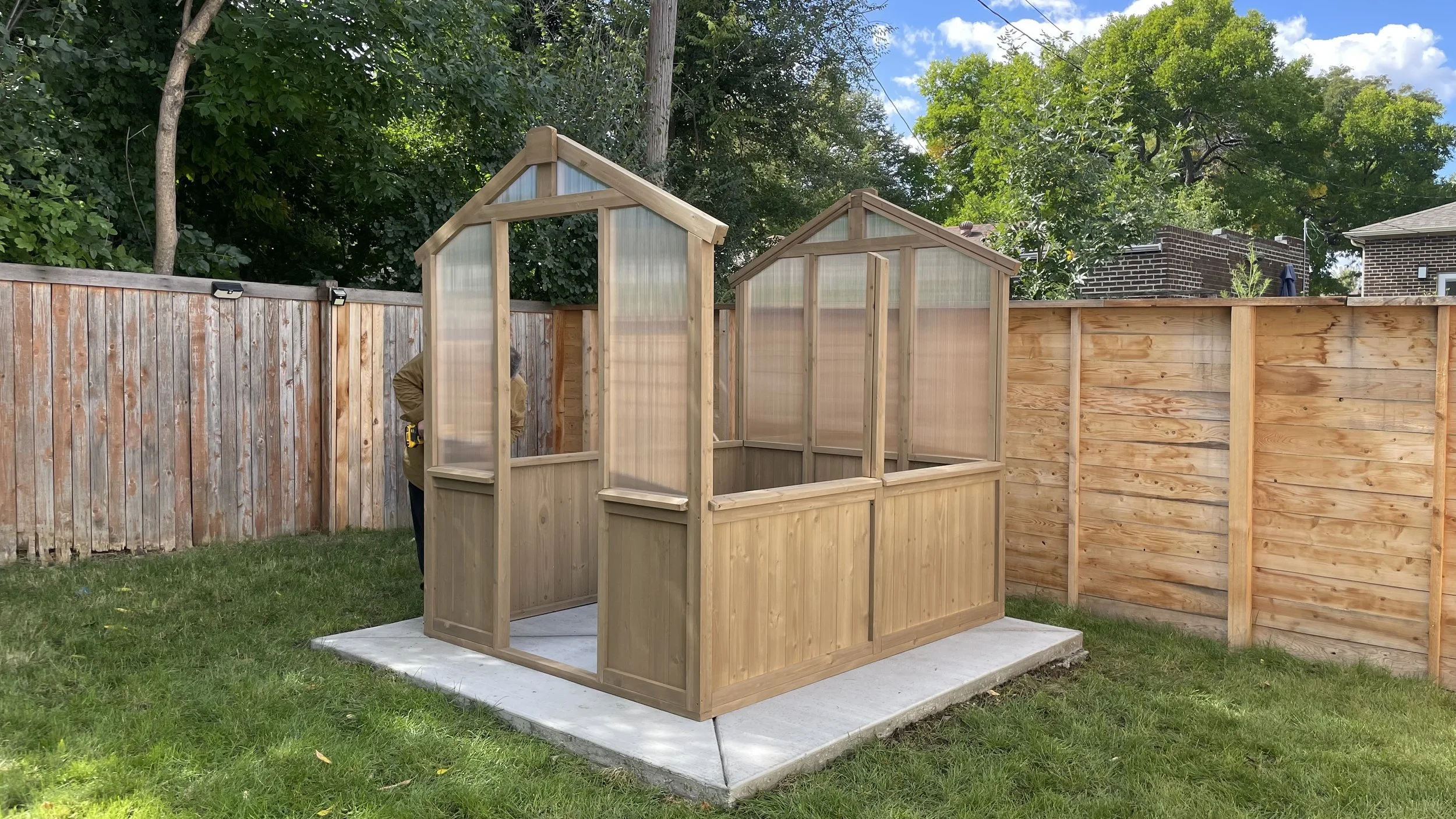 This project features a cedar-framed greenhouse with clear polycarbonate panels that allow abundant natural light while maintaining interior warmth. The sturdy concrete base ensures long-term stability, and built-in wood benches offer functional work surfaces inside. The structure blends beautifully into the backyard, surrounded by trees and fencing, creating a cozy yet highly usable gardening space.