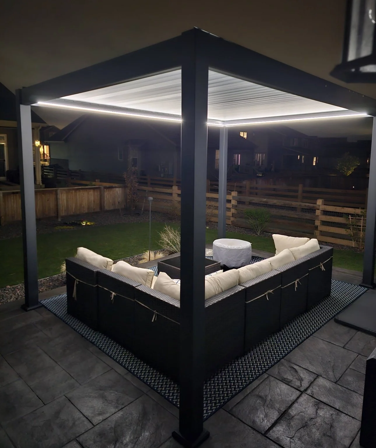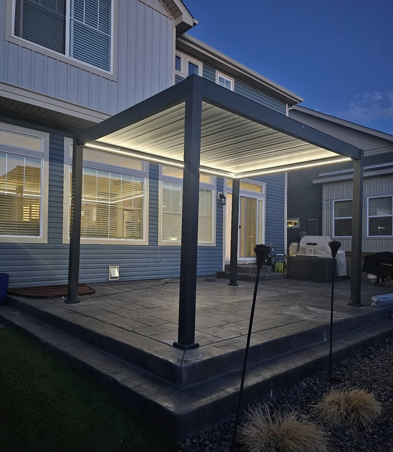 In the heart of Littleton, Colorado, we completed a contemporary pergola project that blends comfort, privacy, and technology. This freestanding metal pergola offers an elevated outdoor experience, equipped with motorized louvers and integrated LED lighting for both functional and aesthetic value.